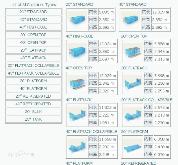 | 20Refigerated(冷冻柜) | 内: 5.480×2.286×2.235 | 17 | 28方 |