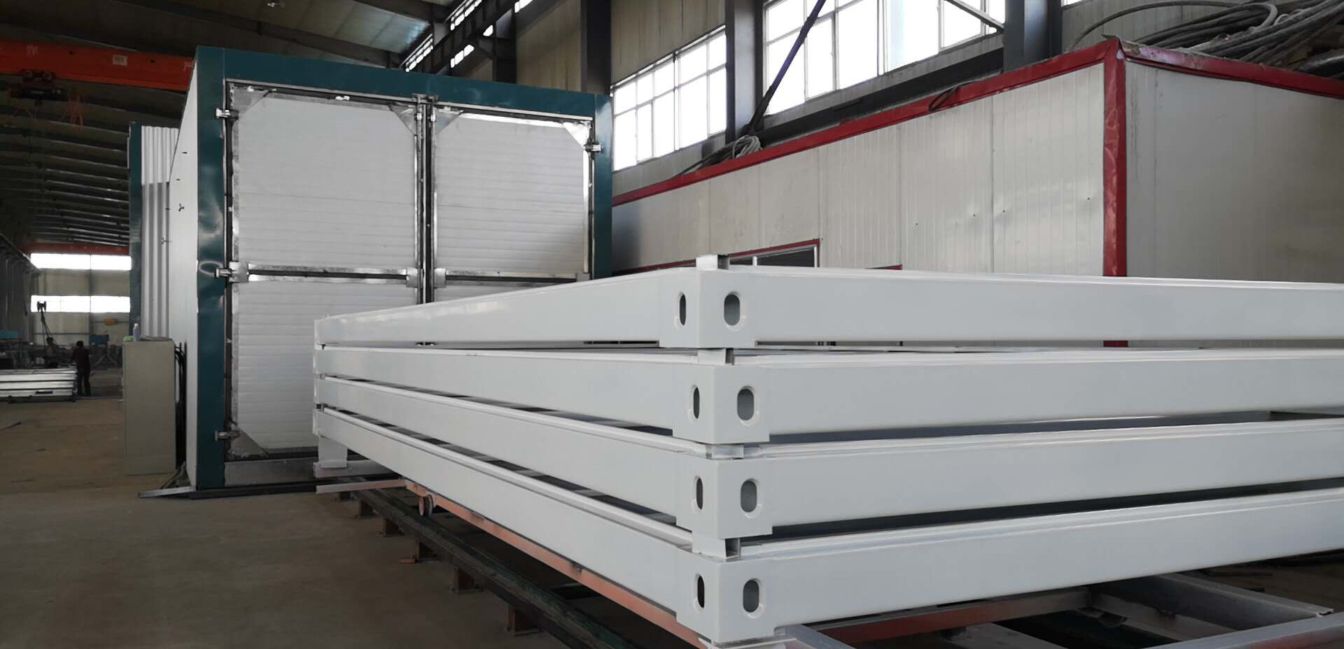 1、打包箱式房屋顶框梁、底框梁、钢柱等钢构件选用3.0mm厚G345强度热镀锌带钢,经专用设备轧制成型;